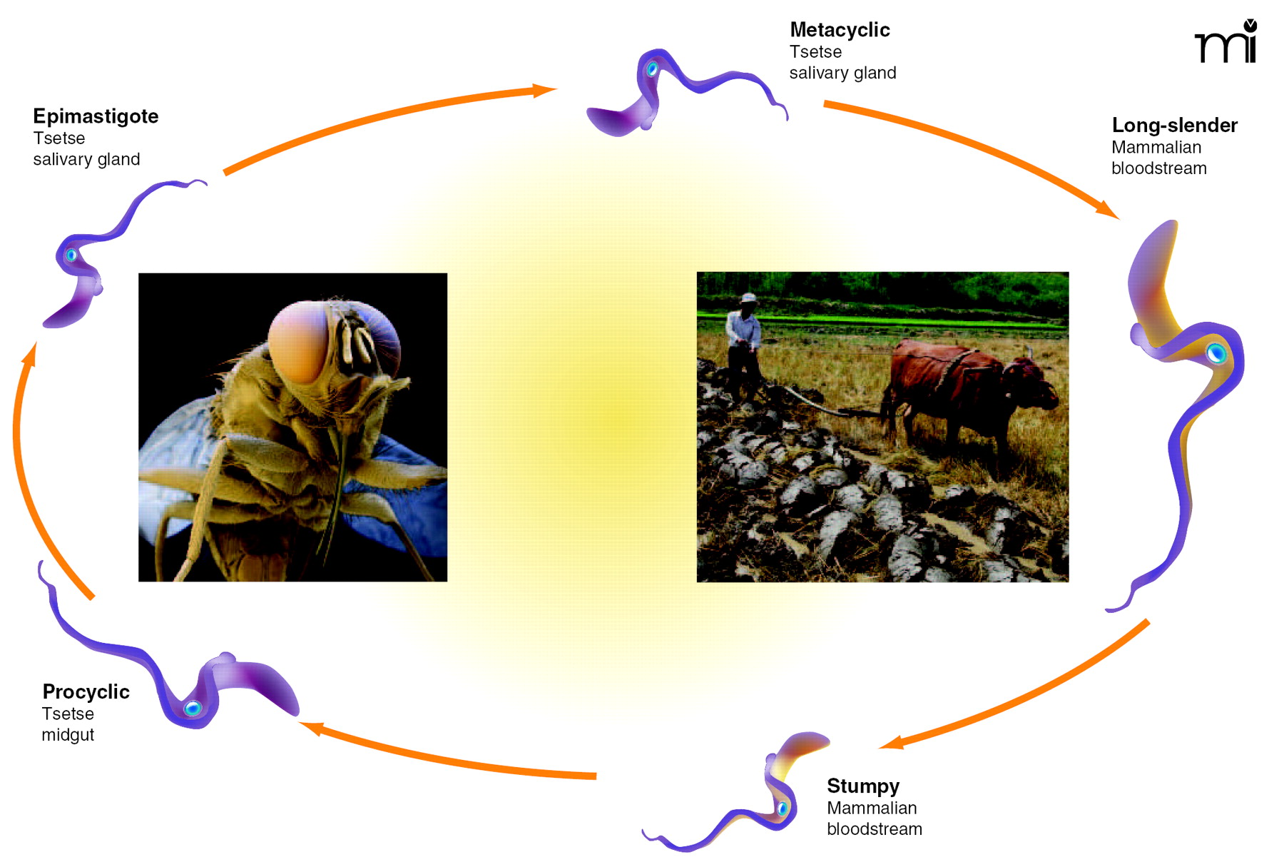 The life cycle ofT. brucei. The trypanosome T. brucei, the causative agent of Afrtican sleeping sickness is capable of living in an arthropod vector (tsetse fly) and in humans. Thus it is no wonder the parasite has a very complex life cycle allowing it to survive (and thrive) in its hosts. Trypanosomes drawn for illustrative purposes only and lack particular details specific to each stage.