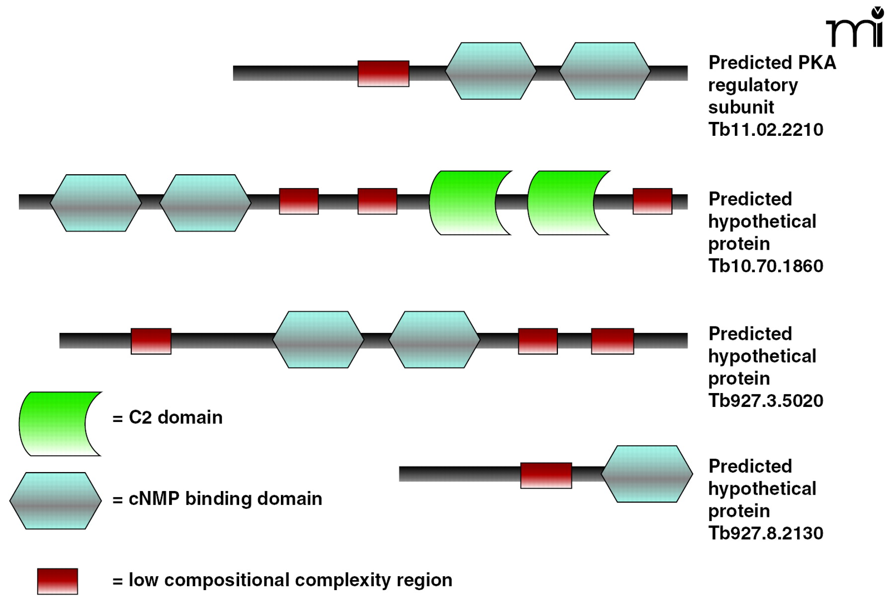 The domain organization of predicted cAMP-binding proteins in theT. bruceigenome. Some of the proteins appear less complex, containing only a single putative cAMP-binding domain, whereas others contain more than one cAMP-binding domain. The details of possible cNMP binding to these domains remain unknown. Other proteins containing predicted cNMP-binding domains are more complex, integrating multiple domains such as the C2 domain. It is hypothesized that these proteins act as scaffolding proteins bringing together diverse cAMP-mediated signaling proteins or interact specifically with other proteins and allow their regulation under the presence of specific cAMP signals.