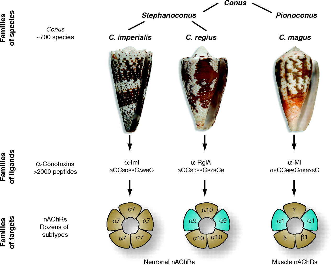 A strategy for concerted discovery of ligand–target interactions and development. The figure provides a simplified overview of a single case study of concerted discovery. Representative species of cone snails are shown from two different subgeneric groups (clades): the worm-hunting Stephanoconus clade and the fish-hunting Pionoconus clade. From these and other Conus species, members of the α-conotoxin family, which generally target nicotinic acetylcholine receptors, were characterized. Different α-conotoxins are found in each species shown; however, the α-conotoxins from the closely related C. imperialis and C. regius (α-ImI and α-RgIA, respectively) are more similar to each other than the α-conotoxin from the distantly related C. magus (α-MI). α-ImI and α-RgIA also target closely related neuronal nAChRs; α7–α10 neuronal nAChRs are believed to form primarily homomeric pentamers. In contrast, α-MI targets the heteromeric nAChR expressed in muscle. The general concept of concerted discovery is that related species of animals produce related (but non-identical) ligands with specificity for related (but non-identical) targets.