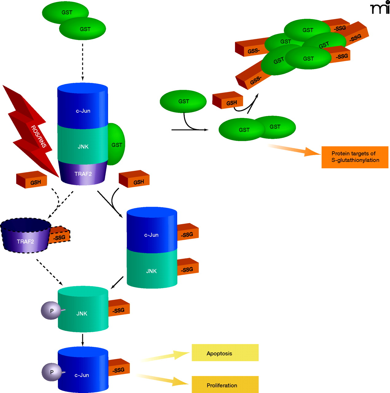 The interplay of protein phosphorylation and protein S-glutathionylation pathways in cell signaling. Under oxidative/nitrosative stress (indicated by ROS/ RNS), pi GST monomers associate with the target proteins c-Jun, JNK, and TRAF2, which are consequently S-glutathionylated (as indicated by –SSG). The immediate effect of S-glutathionylation could be TRAF2 activation, as well as the phosphorylative activation (indicated by –P) of c-Jun and JNK, culminating in the deployment of apoptotic or proliferative pathways. In addition, S-glutathionylation of pi GST results in its aggregation and concomitant inactivation. Dashed lines and arrows indicate hypothetical, rather than experimentally established, steps.