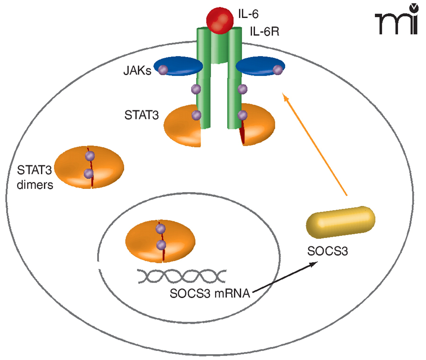 Regulation of IL-6 signaling by SOCS3. IL-6 signaling leads to activation of gp130 and phosphorylation (represented by purple circles) of STAT3 monomers by Janus kinases (JAKs). STAT3 then homodimerizes and translocates to the nucleus, where it induces transcription of a number of target genes, including Socs3. SOCS are believed to inhibit cytokine signaling by either binding to activated cytokine receptors and/or JAKs, or by targeting receptor complexes for degradation. SOCS3 can bind to JAK and the gp130 receptor at phosphotyrosine 759 (pY759) via its kinase inhibitory region (KIR) and Src homology 2 (SH2) domains, respectively, to inhibit JAK-STAT signaling.