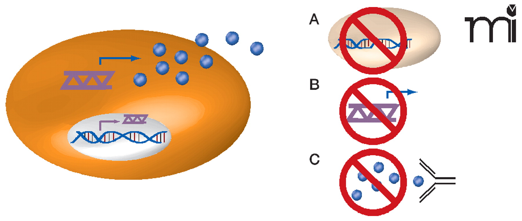 Inhibiting cytokine function impedes oncogenic Ras–driven tumor growth. Oncogenic Ras–mediated activation of cytokine gene transcription (double helix) in tumor cells (orange oval) leads to increased levels of cytokine mRNA (purple wavy line) and protein (blue spheres). The inhibition of cytokine activity may provide a means of treating Ras-driven cancers. Such inhibition has been effected by A) knockout of the cytokine-encoding gene; B) RNA interference (RNAi) targeting the cytokine mRNA; and C) anti-cytokine antibody–mediated neutralization. Each method of has been shown to inhibit Ras-dependent tumor growth. (See text for details.)
