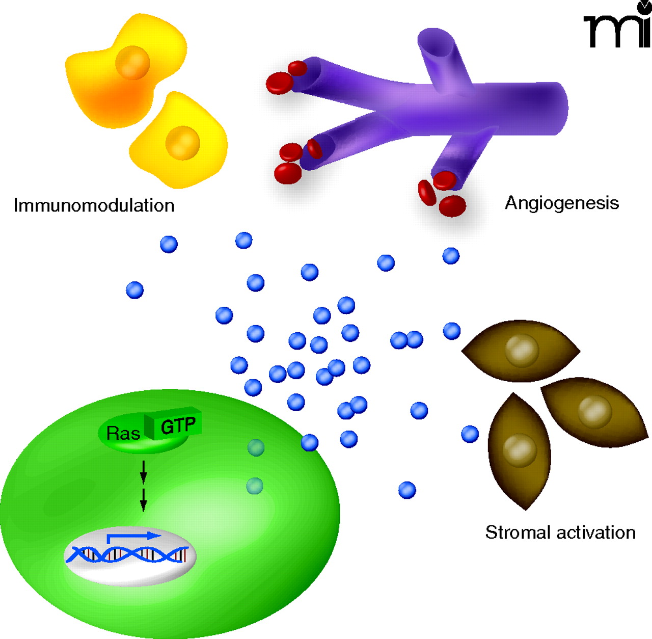 Oncogenic Ras–stimulated paracrine signaling promotes tumor growth. Oncogenic Ras (Ras-GTP) promotes the transcription of cytokine genes (double helix), leading to elevated levels of secreted cytokines (blue spheres) that act to modulate the immune system (yellow cells), promote angiogenesis (purple capillaries) and activate tumor stroma (brown cells).