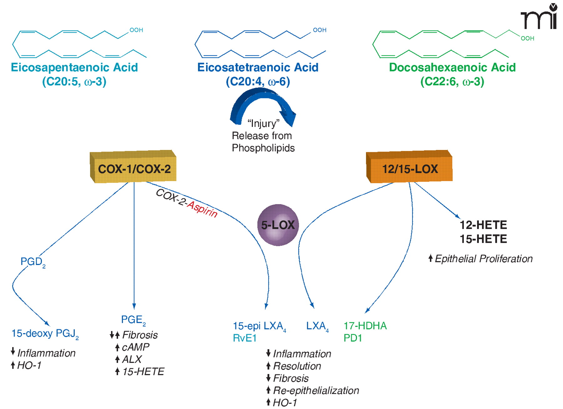 Formation of protective lipid autacoids in response to epithelial injury. Injury triggers phospholipase-dependent release of ω-6 (arachidonic acid) and ω-3 (EPA and DHA) from phospholipid pools. Arachidonic acid, EPA, and DHA are substrates in COX and LOX biosynthetic pathways that produce potent lipid autacoids that control inflammation and promote epithelial wound healing. These pathways include constitutive and inducible components that react to injury in the mucosa, epidermis, and cornea.