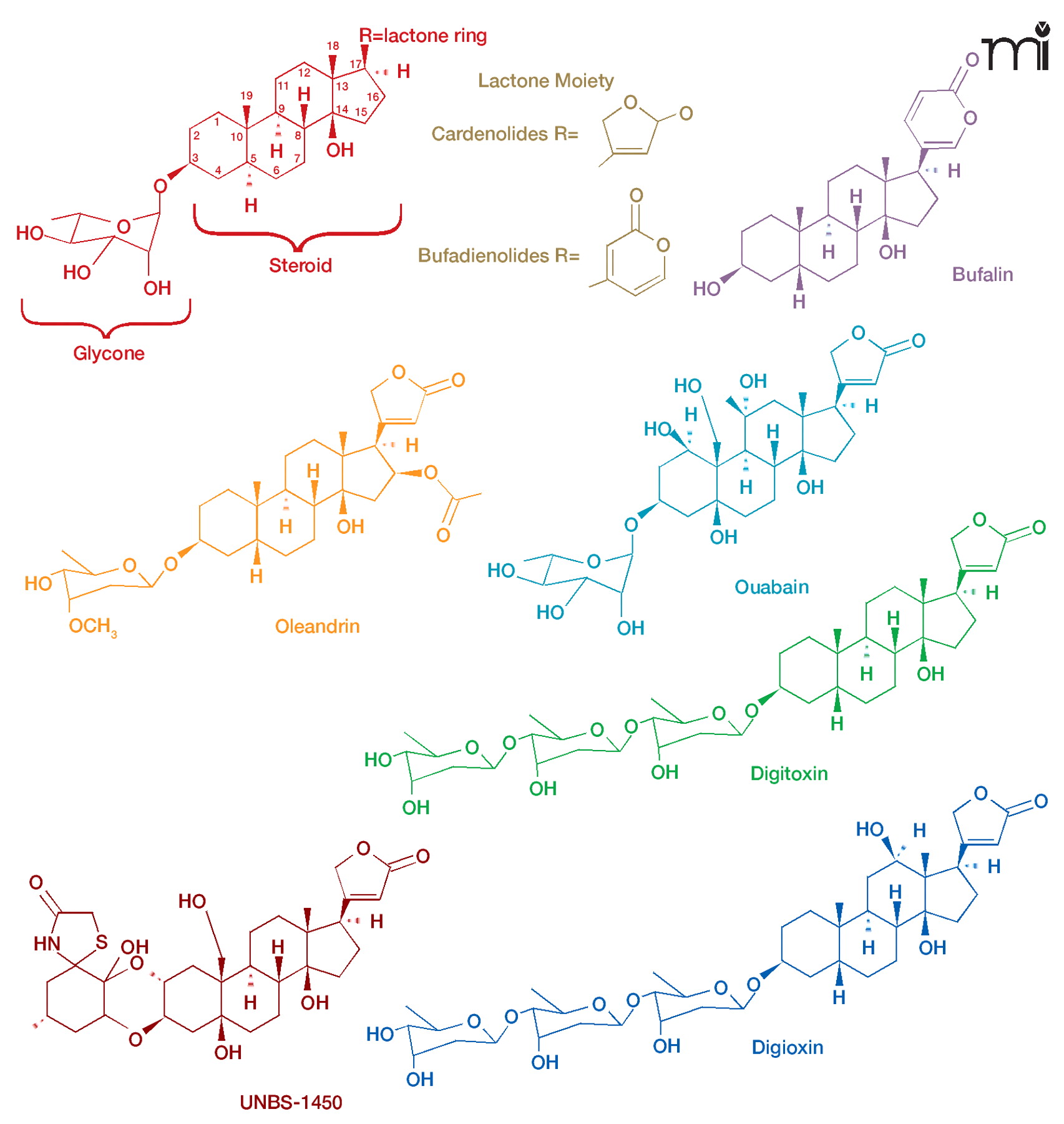 Structures of cardiac glycosides with antiproliferative activity. Representative cardenolide and bufadienolide cardiac glycoside compounds are presented.