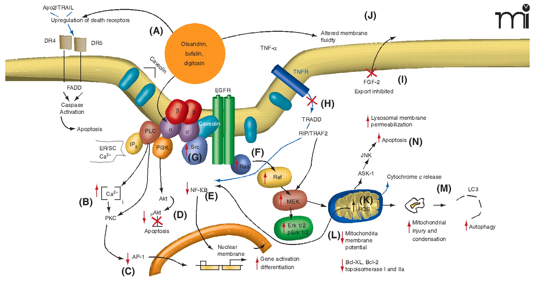 The Na+,K+-ATPase signalosome complex. The binding of selected cardiac glycosides (CGs)––such as oleandrin, bufalin, and digitoxin––to Na+,K+-ATPase results in complex but well-documented changes in cell signaling events. The “signalosome” complex includes the enzyme, Na+,K+-ATPase as well as Src, phosphoinositide-3 kinase (PI3K), and phospholipase C each of which, in turn, sets into action complex signaling events that can result in tumor cell death through either apoptosis or autophagy-related mechanisms. Administration of CGs can (A) increase the (cell surface) expression of death receptors (DR4, DR5) and activate caspase activity; (B) result in increased intracellular calcium concentrations, which, in turn, (C) decreases the expression of transcription factors such as Activator Protein-1 (AP-1). CG treatment can also (D) inhibit activation (i.e., block the phosphorylation) of Akt, which normally blocks apoptosis; (E) inhibit activation of the transcription factor Nuclear Factor-kappaB (NF-κ B); (F) activate the Ras pathway, leading to increase activity of Raf–MAPK pathway; (G) activate Src; (H) inhibit tumor necrosis factor (TNF)-mediated activation of NF-κ B by inhibiting the binding of tumor necrosis factor receptor 1–associated death domain protein (TRADD) to the cellular membrane; (I) inhibit extracellular transport of tumor growth factors, such as fibroblast growth factor-2 (FGF-2); (J) alter membrane fluidity which, in turn, may inhibit Fas-related signaling; (K) lead to the production of reactive oxygen species (ROS) with subsequent injury to mitochondria; (L) produce a decrease in mitochondria membrane potential and a decrease in quantity of anti-apoptotic proteins Bcl-XL and Bcl-2 and topoisomerases I and II; and (M) cause mitochondrial condensation and loss of function, that, in turn, can lead to autophagic processes and cell death (N). Adapted from (30).
