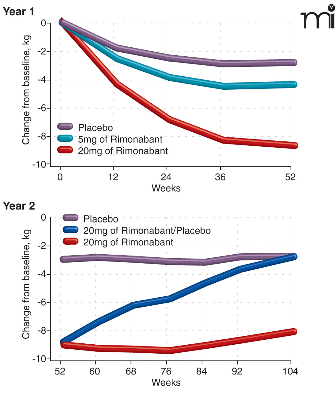 Effect of rimonabant on body weight (RIO-North America trial). In the second year of the trial, subjects who had been on the 20-mg daily dose were randomly re-assigned to either continue treatment or switch to placebo. The observed weight loss was also reflected in reduction of waist circumference (data not shown). [Data reproduced from (7). See text for details.]