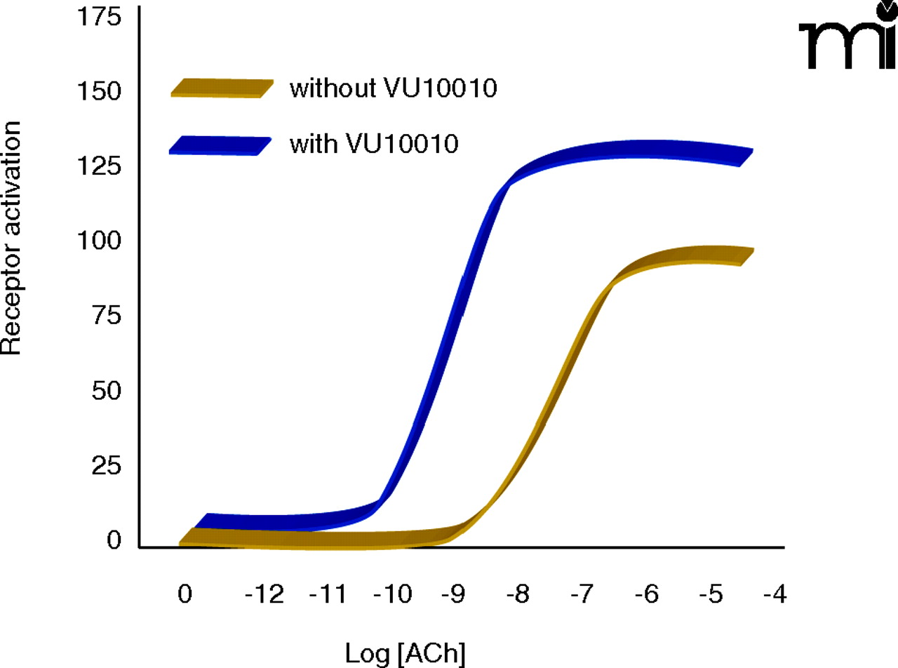 VU10010 acts as an allosteric potentiator of the M4 mACh receptor. VU10010 induces a 50-fold leftward shift of the ACh concentration response curve. VU10010 has an EC50 near 100 nM for the M4 receptor subtype but no activity at any other subtype even at concentrations as high as 100 μM. VU10010 has no detectable affinity for the ACh binding site but allosterically increases affinity of the M4 subtype for ACh. This remarkable specificity, along with the concomitant advantages of allosteric modulation (see Figure 3A), may conform to the ligand characteristics necessary to target pathways and symptoms of complex diseases such as schizophrenia. See text for details.