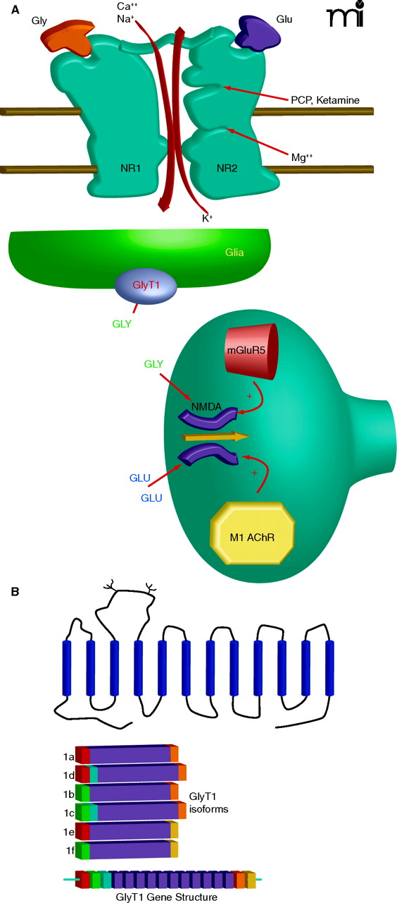 The NMDA receptor hypofunction hypothesis and mechanisms to increase NMDA receptor function. (A) NMDA receptor function may be approached by direct activation (GlyT1 inhibtion) or indirect activation by activating GPCRs (M1 and mGluR5) that physically and functionally interact with the NMDA receptor. The binding site of the co-agonist glycine on the NR1 subunit and the the binding site of the co-agonist glutamate on the NR2 subunit are indicated. (B) The structure of GlyT1, a 12-transmem-brane domain Na+/Cl− dependent neurotransmitter transporter, is schematized along with the gene structure of GlyT1 and the six major iosforms of GlyT1. See text for details.