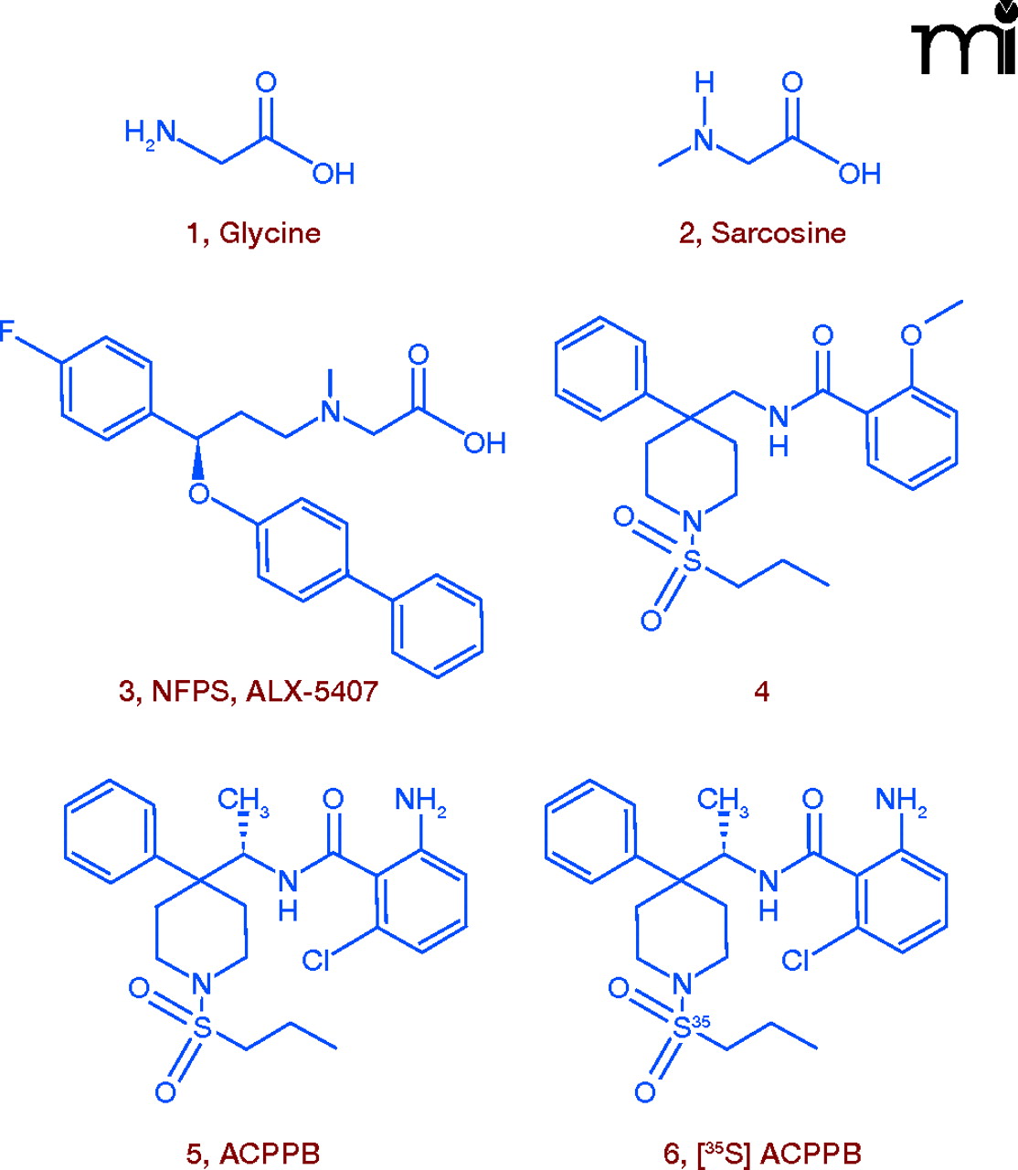 Design of GlyT1 Ligands. Structures of glycine 1 (co-agonist of the NMDA receptor), sarcosine 2 (a weak GlyT1 inhibitor) and NFPS 3 (ALX-5047), the prototypical sarcosine-derived GlyT1 inhibitor, competitive, non-sarcosine-derived GlyT1 inhibitor lead 4, optimized GlyT1 inhibitor 5 (ACPPB), and the radiolabelded congener [35S]ACPPB, 6. See text for details.