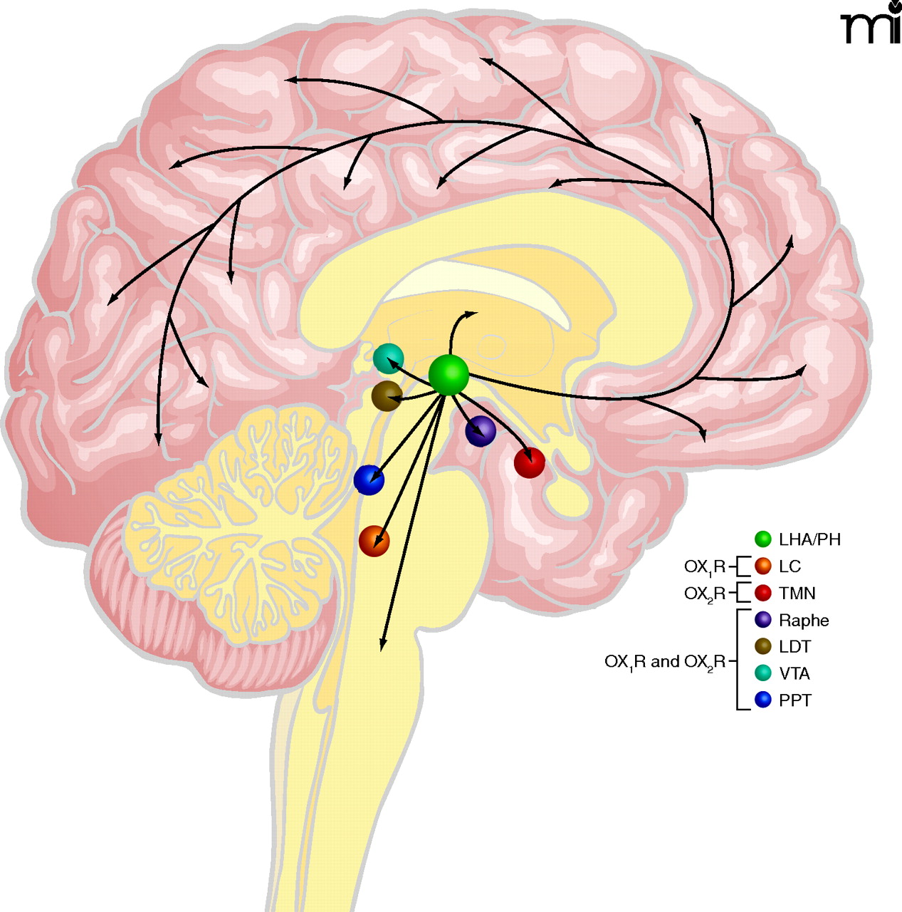 Main projections of orexin neurons. This figure summarizes orexinergic projections in the human brain as predicted from rodent studies. Circles show regions with strong expression of orexin receptors type 1 and type 2 (OX1R and OX2R, respectively) and dense orexinergic projections. Orexin neurons originating in the lateral hypothalamic area (LHA) and posterior hypothalamus (PH) regulate sleep and wakefulness and the maintenance of arousal by sending excitatory projections to the entire CNS, excluding the cerebellum, with particularly dense projections to monoaminergic and cholinergic nuclei in the brain stem and hypothalamic regions, including the locus coeruleus (LC, containing noradrenaline), tuberomammillary nucleus (TMN, containing histamine), raphe nuclei (Raphe, containing serotonin) and laterodorsal/pedunclopontine tegmental nuclei (LDT/PPT), containing acetylcholine). Orexin neurons also have links with the reward system through the ventral tegmental area (VTA, containing dopamine) and with the hypothalamic nuclei that stimulate feeding behavior. Figure from (1). Used with permission.