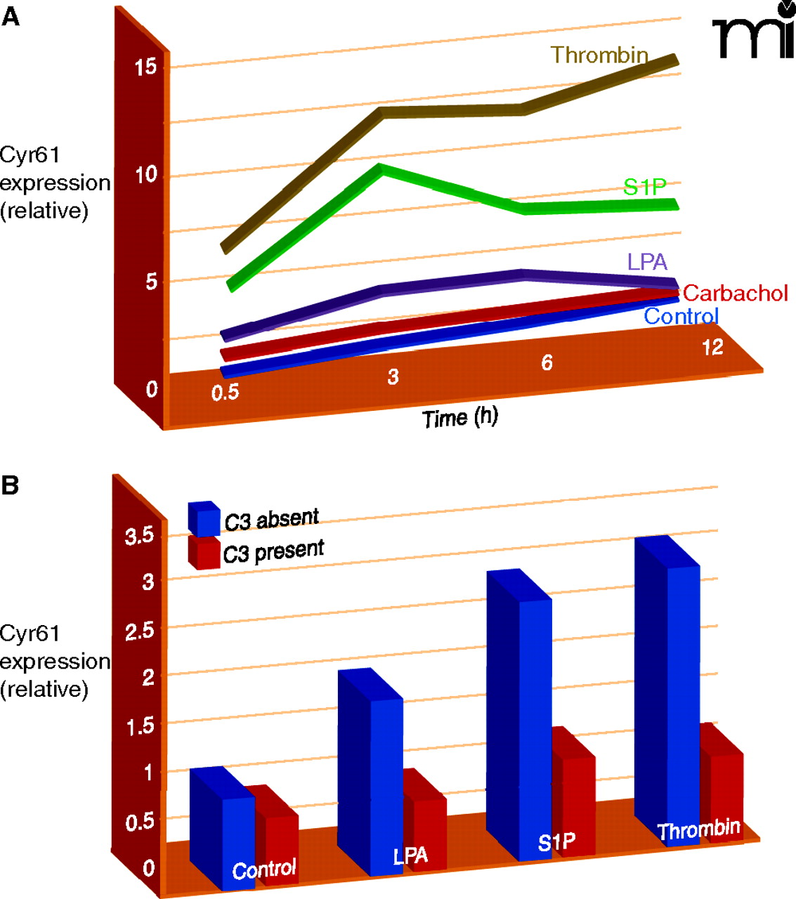 Kinetic expression profile of Cyr61/CCN1 after GPCR stimulation and Rho dependence of CCN1 protein expression after GPCR stimulation. (A) CCN1 kinetic expression profile in 1321N1 glioblastoma multiforme cells treated with vehicle (Control), 500 μM carbachol, 10 μM lysophosphatidic acid (LPA), 10 μM sphingosine-1-phosphate (S1P), or 0.5 U/ml thrombin. Mean densitometric values for CCN1 normalized by actin are shown. (B) 1321N1 cells were treated overnight with C3 toxin from Clostridium botulinum followed by stimulation with 10 μM lysophosphatidic acid (LPA), 10 μM sphingosine-1-phosphate (S1P), or 0.5 U/ml thrombin for 3 hours.