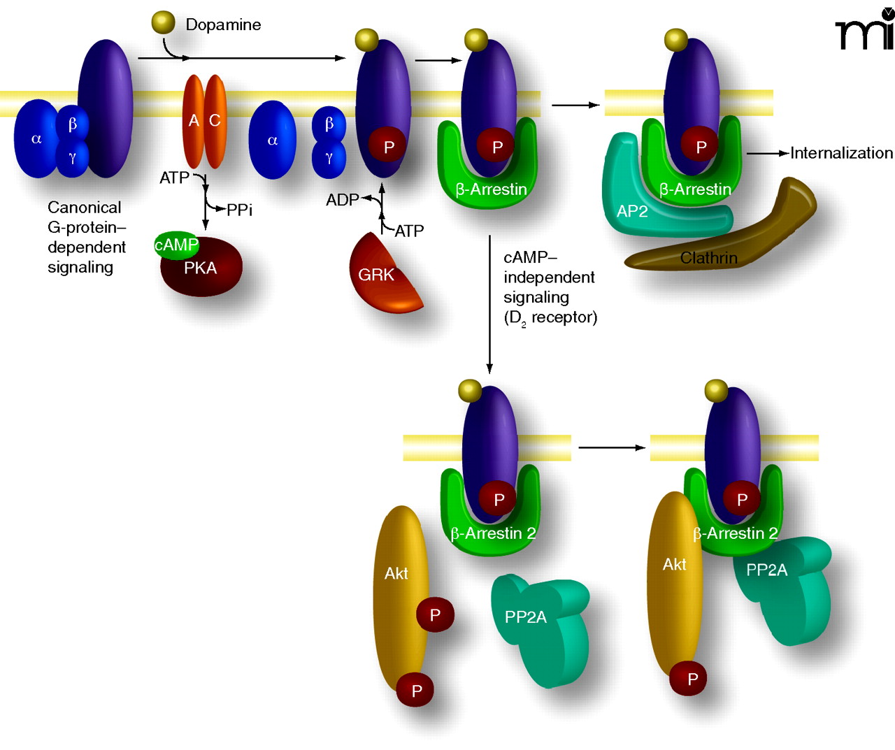 Dual role of β–arrestins in mediating GPCR desensitization and G protein–independent signaling. Activation of dopamine receptors (DAR) activates G proteins, which leads to activation (Gαs) or inhibition (Gαi/o) of adenylyl cyclase and modulation of the cAMP-dependent protein kinase PKA (G protein–dependent signaling). This is rapidly followed by receptor phosphorylation by GRKs and the recruitment of β–arrestins, leading to termination of G protein signaling and formation of an internalization complex formed by β–arrestin 1 and/or β–arrestin 2, AP2, clathrin. Recruitment of β–arrestin 2 following activation of D2-class receptors also results in the formation of a signaling complex composed at least of β–arrestin 2, PP2A, and Akt, which results in a deactivation of Akt by PP2A and subsequent stimulation of GSK3-mediated signaling.