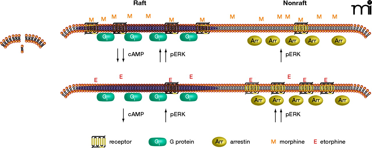 Functional selectivity of μ-opiate receptor ligands and membrane raft domains. Upon binding of morphine (top panel, left), the receptor conformation has a greater affinity for Gi, which is localized to the raft domain. Signaling through Gi inhibits adenylyl cyclase to decrease cyclic AMP and leads to increased phosporylation of ERK. The morphine-activated receptor has a lower affinity for β-arrestin––localized to nonraft domains (top panel, right)––which leads to ERK phosphorylation. The etorphine-bound receptor (bottom panel, right), favors coupling to β-arrestin, leading to greater ERK activation and relatively lesser inhibition of adenylyl cyclase. Arr, β-arrestin; cAMP, cyclic adenosine 3′,5′-monophosphate; E, etorphine; ERK, extracellular signal–regulated protein kinase; Gi, inhibitory G protein; M, morphine.