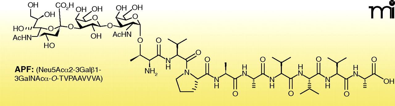 The sequence of Antiproliferative Factor (APF). APF consists of a primarily hydrophobic nonapeptide sequence covalently linked to a trisaccharide. Although a terminal sialic acid moiety is present in the natural product, sialylation is not required for APF’s activity, although the presence of a glycan is critical. The de-sialylated peptide, termed asialo-APF (as-APF), has the same biological activity and nearly the same potency of APF. T, threonine; V, valine; P, proline; A, alanine. Used by permission (9).