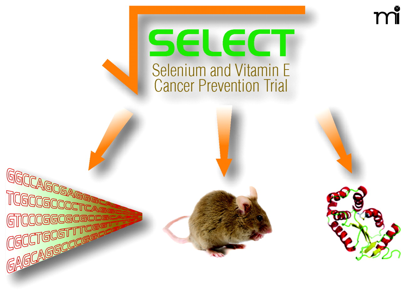 One outcome of SELECT is the need for basic studies to understand selenium biology. Three basic approaches are illustrated in the figure by a nucleotide sequence highlighting the need for additional human genetics and polymorphism analyses, a mouse for the use of animal models and a protein structure for the functional analyses of selenoproteins.
