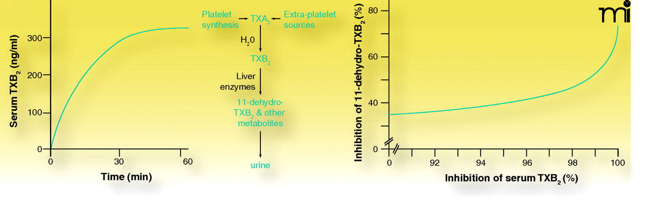 Assessing the relationship between inhibition of platelet COX-1 activity and thromboxane biosynthesis in man. In human platelets (left), the maximal capacity for COX-dependent prostanoid synthesis ex vivo (here, measured as TXB2 produced during whole blood clotting) is three orders of magnitude greater than the basal in vivo biosynthetic rate of thromboxane (middle panel, calculated according to excretion of liver-metabolized products in urine; designated as 11-dehydro-TXB2 & other metabolites). Following aspirin administration, the relationship between inhibition of platelet cyclooxygenase activity measured ex vivo (serum TXB2), and inhibition of thromboxane biosynthesis in vivo (urinary 11-dehydro-TXB2) is non-linear, with substantial inhibition of the latter only occurring at complete suppression of the former (right panel). [ See (8, 10) and references therein.]