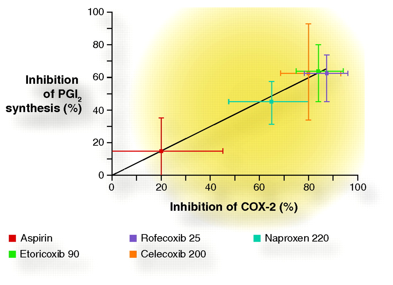 Assessing the relationship between inhibition of COX-2 activity and prostacyclin biosynthesis in man. Systemic inhibition of COX-2 activity was determined as inhibition of LPS-induced PGE2 production in whole blood ex vivo, and inhibition of prostacyclin production was determined as reduced urinary excretion of of 2,3-dinor-6-keto-PGF1α, a major enzymatic metabolite of prostacyclin. In response to the administration of five different COX inhibitors, the relationship between inhibition of COX-2 activity and inhibition of prostacyclin biosynthesis was linear, with substantial inhibition of the latter occurring at levels of incomplete suppression of the former. [Reproduced from (24) with permission from the American College of Cardiology.]
