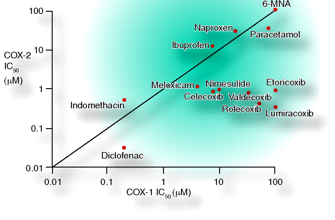 Selectivity of various drugs with regard to inhibition of COX-1 and COX-2. IC50 values represent the mean of three or four determinations in whole blood assays. Drugs that appear below the diagonal line indicate preference for COX-2 inhibition over COX-1 inhibition. 6-MNA denotes 6-methoxy-2-naphthylacetic acid, the active metabolite of nabumetone. Updated from (2).