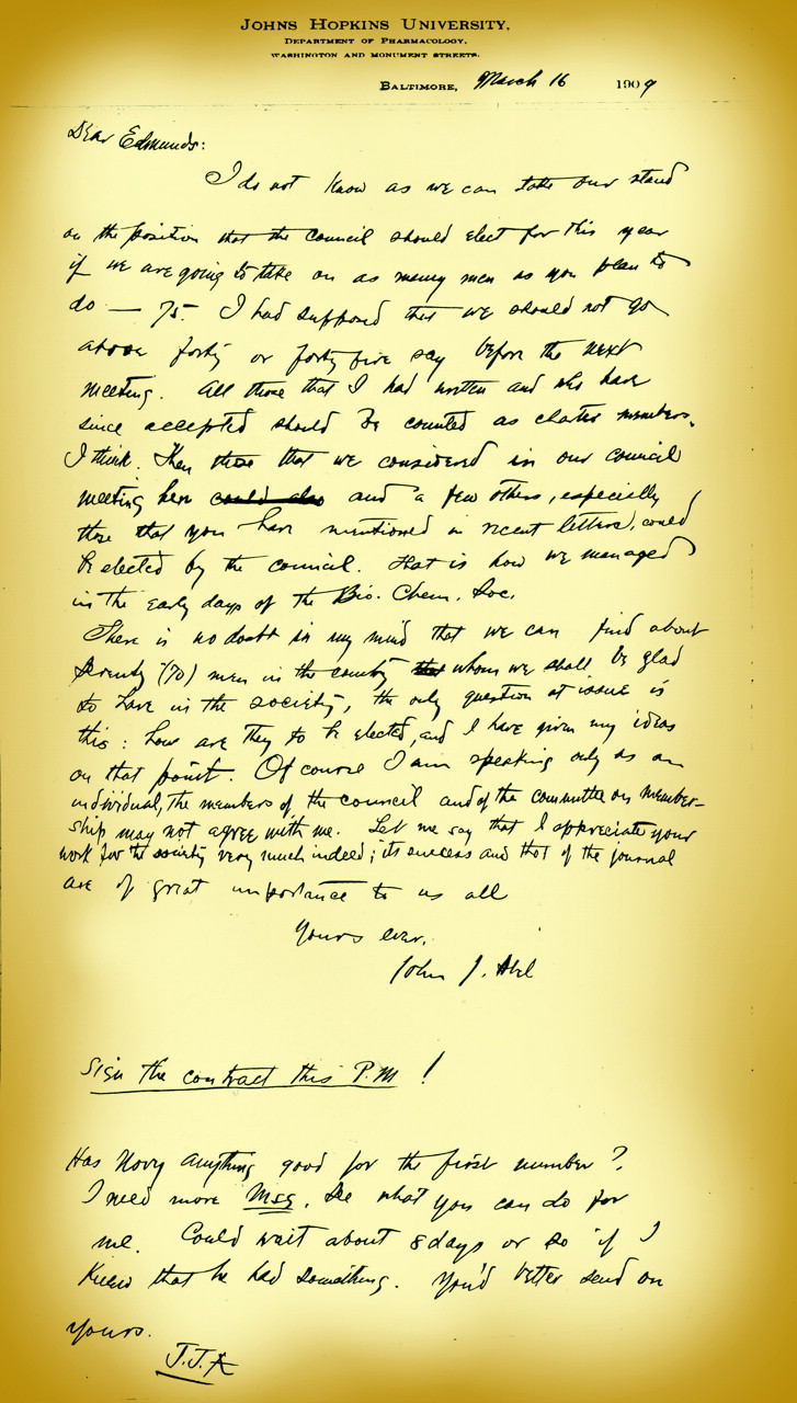 Abel’s letter, March 16, 1909 announcing the funding of JPET: “sign [sic] the contract this P.M!”