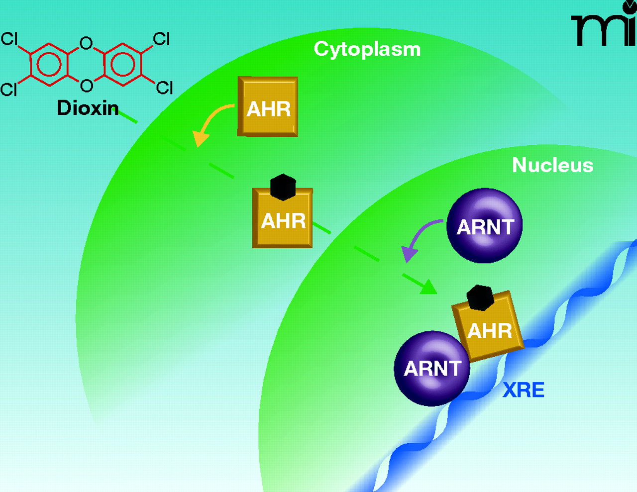 “Classical” pathway of AHR action. Dioxin (also denoted by the black hexagon) passes into the cytoplasm passively and binds to AHR. AHR translocates into the nucleus where it discards its associated chaperone proteins (not illustrated), dimerizes with ARNT, and binds to XRE sequences in responsive genes.