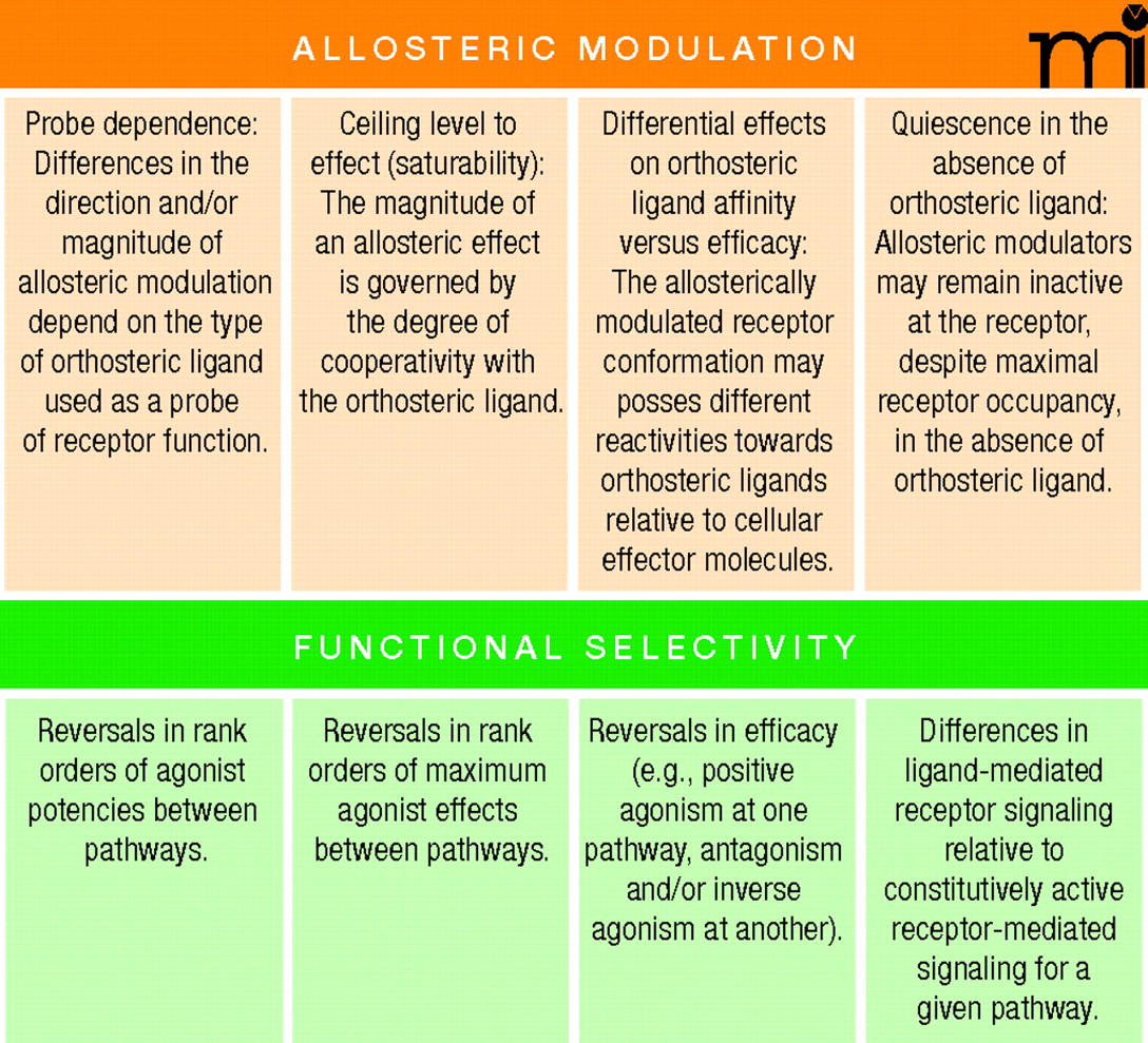 Characteristics of GPCR allosteric modulation and functional selectivity. See text for details.