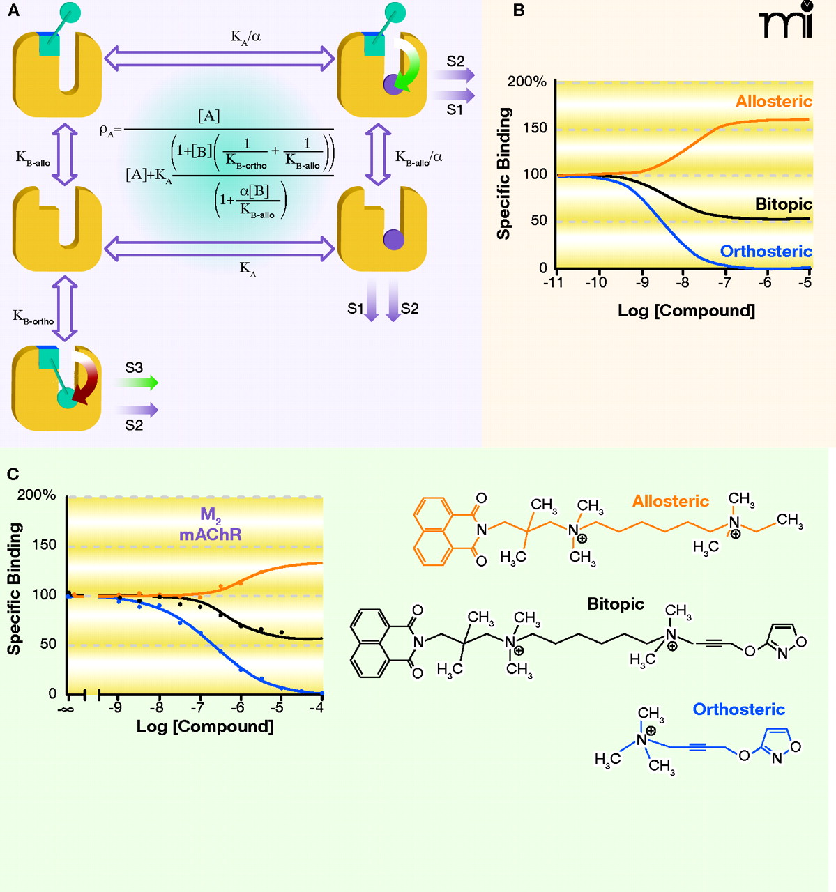 A bitopic, orthosteric/allosteric, model of GPCR ligand action predicts novel pharmacological properties. (A) A bitopic scheme and associated equation describing fractional equilibrium occupancy (ρA) of orthosteric probe (circle) in the presence of bitopic ligand [square (allosteric pharmacophore) linked to circle (orthosteric pharmacophore)]. The curved arrows denote the potential for allosteric modulation. Also shown is the potential for differential signaling (S) between an orthosteric and a bitopic ligand. (B) Simulations based on the bitopic model with the following parameters: [A] = KA =1 nM; KB-ortho = 3 nM; KB-allo = 30 nM; α = 4. (C) Experimental proof of concept of a bitopic binding phenomenon, as determined at the M2 muscarinic acetylcholine receptor. The indicated ligands were each tested against the equilibrium binding of the orthosteric probe NMS. Data replotted from (41).