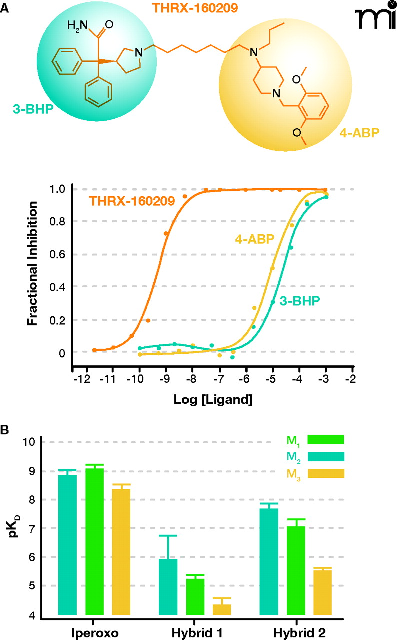 Bitopic ligand design as a means for optimized affinity or selectivity. (A) Effects of the bitopic ligand THRX-160209 and its constituent orthosteric (3-BHP) or allosteric (4-ABP) moieties on the binding of the orthosteric probe NMS at the M2 muscarinic receptor. Adapted from from (43). (B) Loss of affinity, but gain in selectivity, as exemplified by the bitopic ligands, “hybrid 1” (2-{3-[1-(6-{1,1-Dimethyl-1-[4-(isoxazol-3-yloxy)but-2-ynyl]-ammonium}hexyl)-1,1 dimethylammonio]propyl}isoindoline-1,3-dione dibromide) and “hybrid 2” (2-{3-[1-(6-{1,1-Dimethyl-1-[4-(isoxazol-3-yloxy)but-2-ynyl]-ammonium}hexyl)-1,1-dimethylammonio]-2,2-dimethylpropyl}-benzo[de] isoquinoline-1,3-dione dibromide), relative to the non-selective orthosteric agonist iperoxo. Native muscarinic acetylcholine receptors are expressed in guinea pig left atrium (M2), rabbit vas deferens (M1), and guinea pig ileum (M3). Adapted from (41).