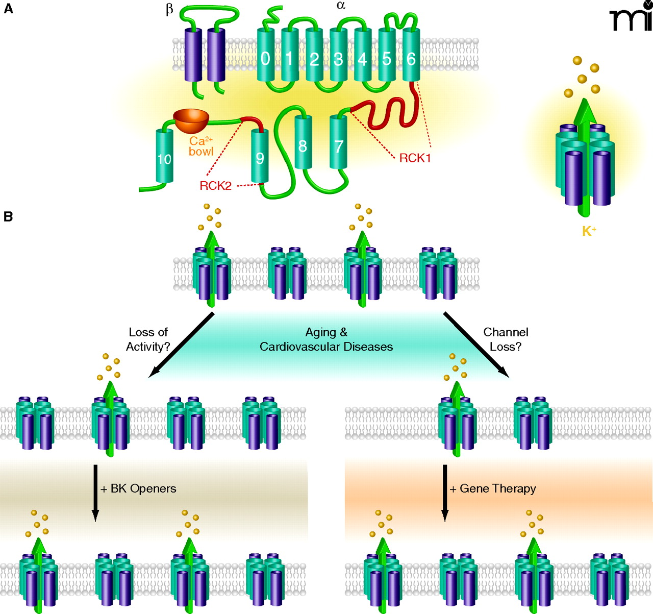 Schematic diagrams of the BK channel structure and the therapeutic strategies to restore BK channel function to the vasculature during aging and cardiovascular diseases. (A) The structure of the pore-forming α subunit (BKα) and regulatory β1-subunit (BKβ1) of the BK channel. Four BKα subunits co-assemble with four BKβ1 subunits to form the channel heteromultimer (shown at right). (B) Schematic diagram depicting BK channel abnormalities in aging and cardiovascular diseases and possible therapies. Left: A disease-related loss of channel activity may be amenable to treatment with BK channel openers that increase channel activity to promote vasodilation. Right: The loss of the BKα and/or BKβ1 channel proteins associated with aging and cardiovascular diseases may be restored by gene therapy using smooth muscle-specific promoters to re-express these subunits as functional BK channels in diseased VSMCs.