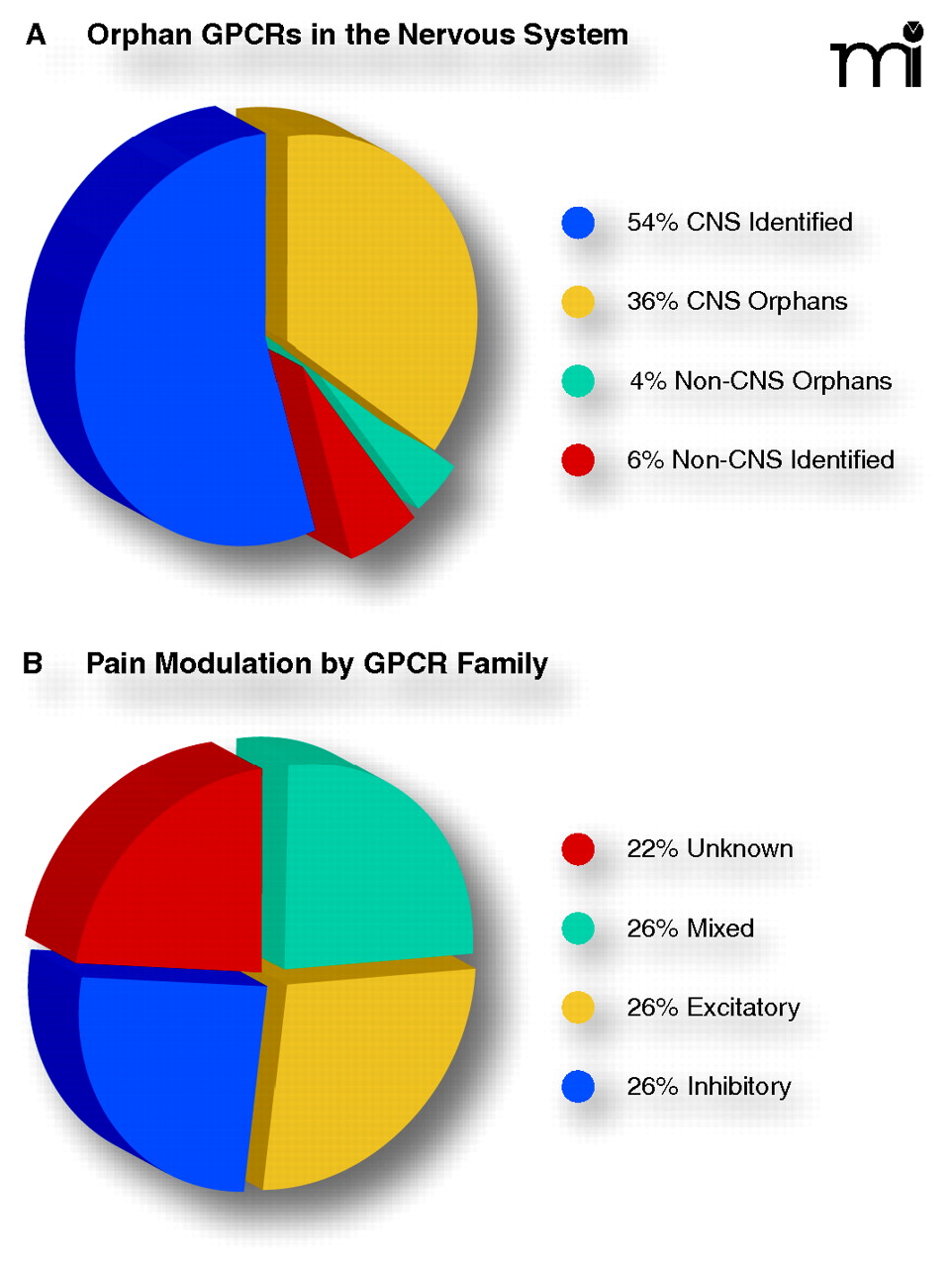 Current status and opportunities in GPCR targeting. A) Predicted proportions of human GPCRs by nervous system expression (90%) and orphan status (40%). Approximately one-third of all GPCR genes encode orphan receptors that are expressed in the CNS. The endogenous ligand(s) and physiological function(s) of these receptors remain to be discovered, representing enormous opportunities for drug development. B) Modulatory effects of GPCRs organized by family. The equal distribution of inhibitory, excitatory, and mixed functional families suggests an equal balance between pro- and anti-nociception.