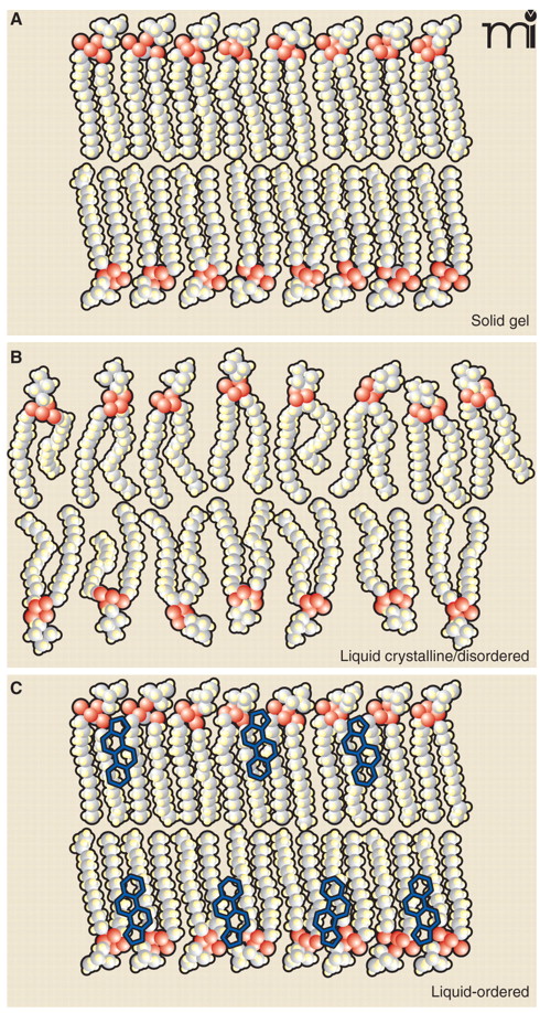 The dynamic lipid bilayer and membrane phases. Three different phases are generally described for membrane lipids. A) In the “solid gel state,” or “solid crystalline state,” hydrocarbon chains are typically found in the trans configuration and are highly ordered. Low temperatures can favor the solid gel phase. B) This “liquid crystalline state,” or “liquid disordered state,” is typical of high temperature and shows a disordered configuration of acyl chains. High lateral mobility is associated with the liquid disordered state; most pure fatty acid, detergent, or phospholipid liposomes are found in this state at room temperature. C) The “liquid ordered state” occurs in the presence of high levels of sphingolipids and cholesterol and results in mobility slightly under that of the pure liquid disorderd state. Detergent-resistant microdomains or lipid rafts are endogenous liquid-ordered membrane patches. See text for details. Adapted from (63).