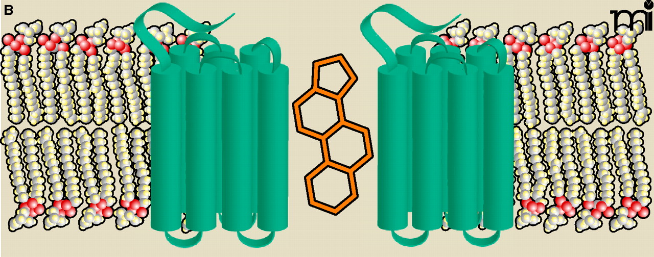 Lipid moieties found within high-resolution structures of integral membrane proteins. A) A high-affinity aspartate transporter (GltTph) from Pyrococcus hirokoshii resolved at 3.2Å. Surface representation of a single GltTph monomer, colored by atom type, with the interacting palmitate molecule colored green. At right, the hydrophobic residues that are positioned to interact with the lipid molecule are shown. B) Membrane topology of the human β2-adrenergic receptor based on the crystal structure resolved at 2.4 Å. Intriguingly, association of the two receptor molecules (blue) appears to be mediated by cholesterol (orange). [Adapted from (34, 64).]