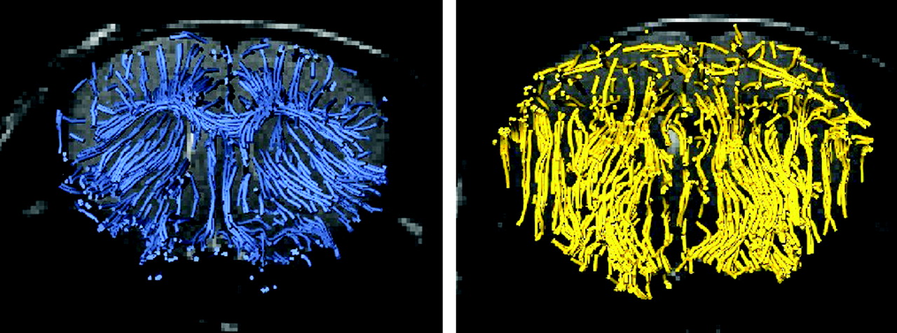 Abnormalities of white matter fiber tracts in the transgenic mouse model of Alzheimer’s disease (Tg 2576) indicated by diffusion tensor MRI (DTI). White matter fiber tractography of wild-type (WT) and transgenic (Tg) mice. Structural orientation of corpus callosum (arrows) in WT can be readily observed (connecting the left and right hemispheres), whereas the fiber tracts were highly disoriented in the diseased TG animal. Of note, white matter structural abnormaility was also observed from the DTI study of AD patients.