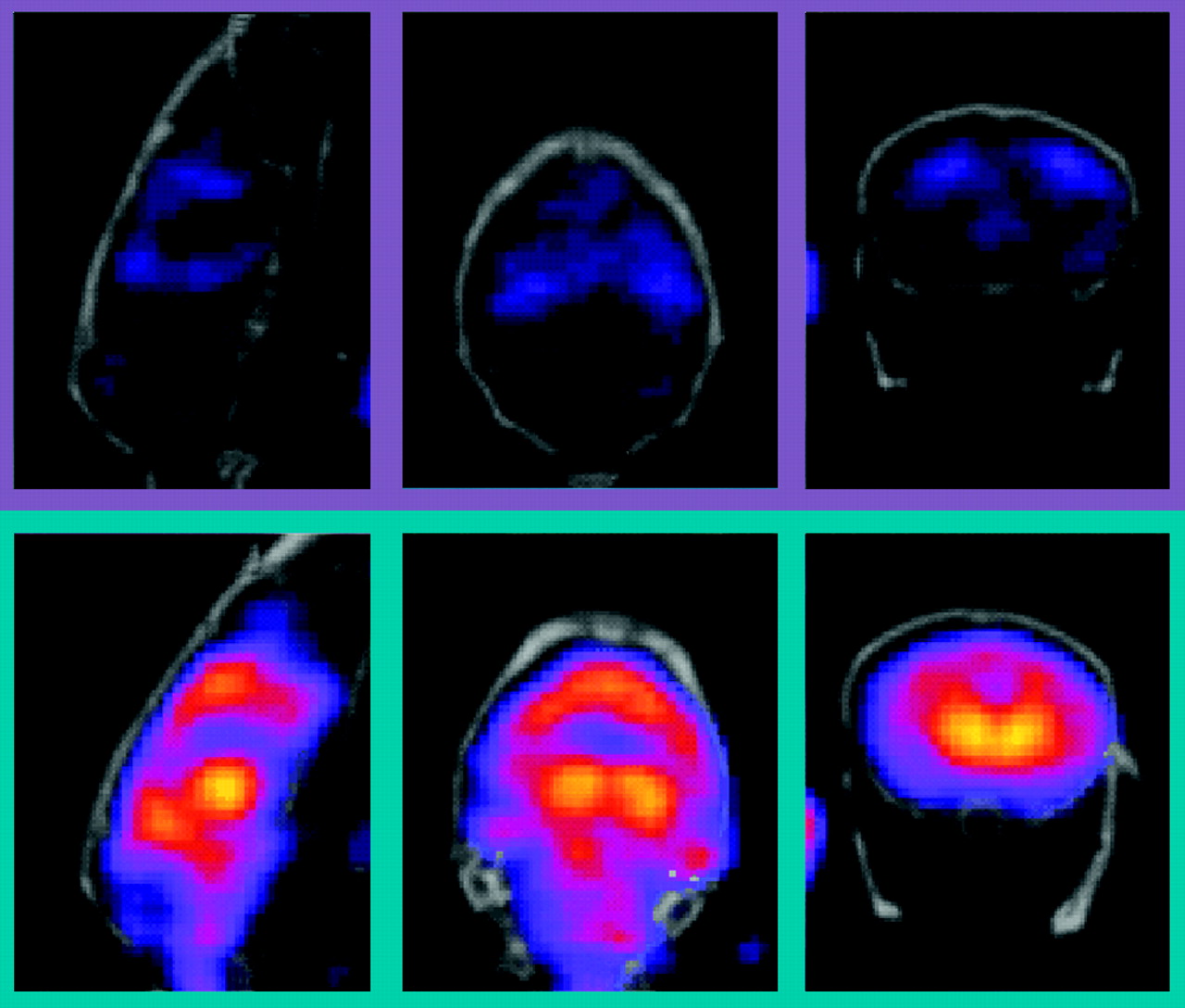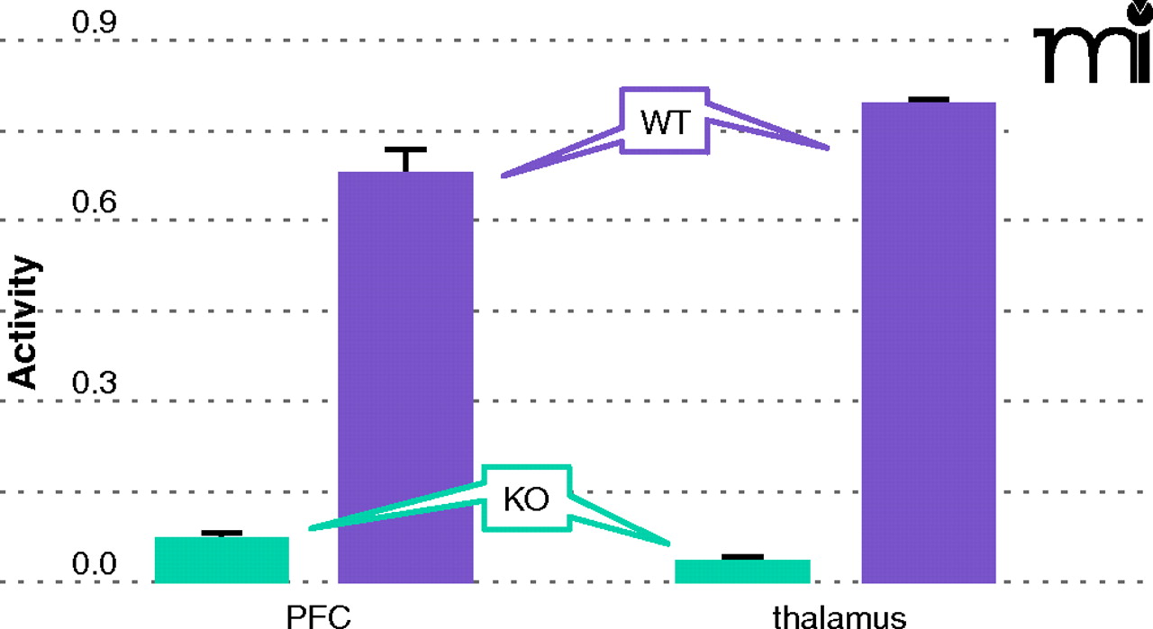 In vivo imaging of the neuronal nicotinic receptor β2 subtype. Knock-out (KO) and wild-type (WT) mice were imaged using the [123I]5-IA SPECT tracer. Specificity of target engagement of the PET/SPCET tracer can be assessed using genetically modified mice. We examined the binding specificity of [123I]5-IA to neuronal nicotinic receptor subtypes in KO (n= 4) and WT (n=2) mice. Fifty minutes after the infusion of 0.5mCi tracer, each mouse was imaged for forty-five minutes. Representative images clearly show the reduction of tracer uptake in KO mice, and quantitative region-of-interest analysis indicated significant decreases in binding activity at both prefrontal cortex (PFC) and thalamus.