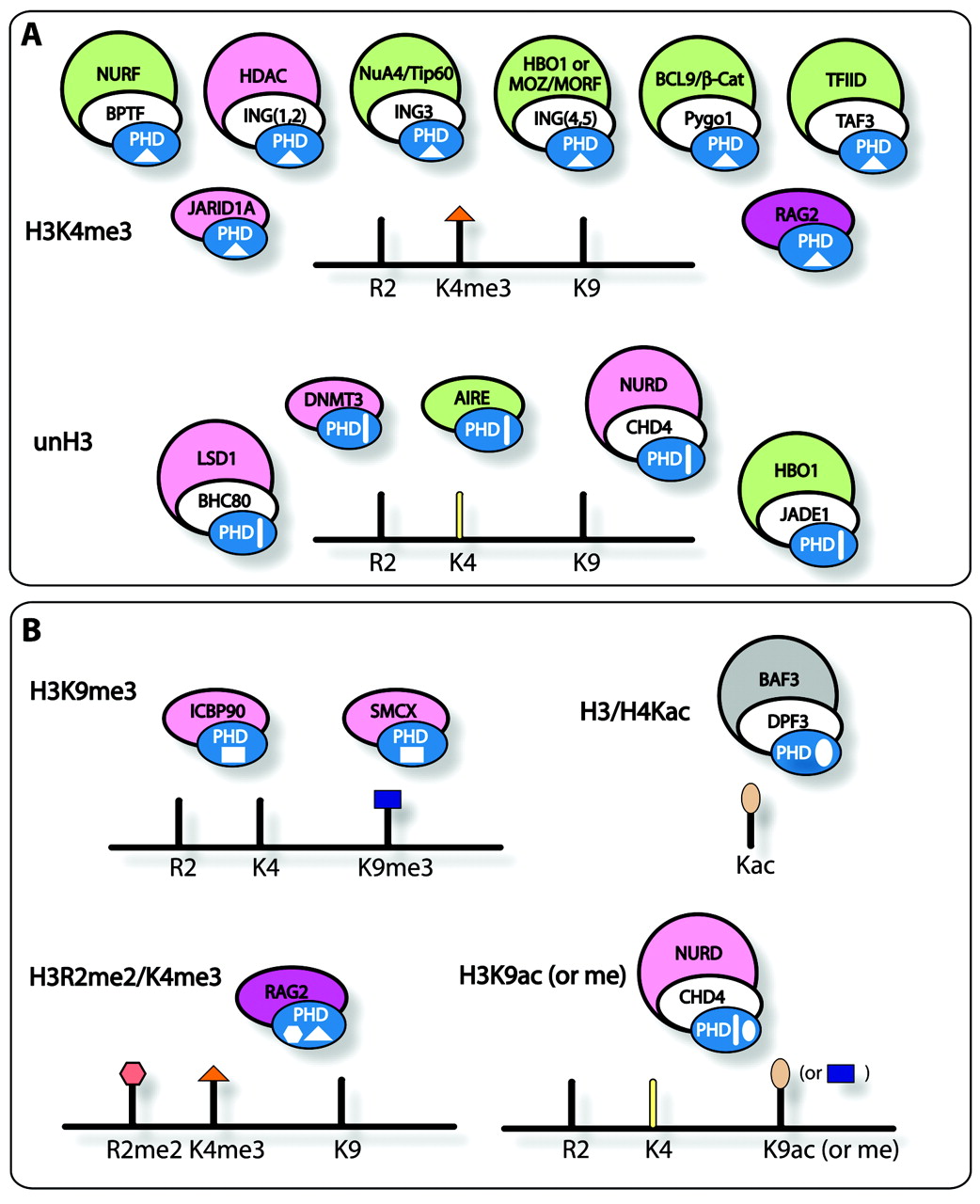 PHD fingers as epigenetic effectors. Shown are the PHD fingers and associated complexes that recognize A) H3K4me3 (orange triangle) or unH3 (yellow bar) and B) other PTMs (including H3 methylated at both Arg2 (R2me2, salmon hexagon) and Lys4 (K4me3, orange triangle) and H3K9me3 or H3K9ac (taupe oval or blue rectangle). Complexes are colored by their function as promoters of gene activation (green), repression (pink), or recombination (purple).